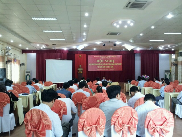 Thực hiện nhiệm vụ tham mưu giúp UBND tỉnh trong quản  lý nhà nước về công tác bán đấu giá tài sản, ngày 25/8, tại thành phố Vinh, Sở Tư pháp tổ chức lớp tập huấn bồi dưỡng kiến thức pháp luật và kỹ năng nghiệp vụ đấu giá tài sản cho gần 200 đại biểu với các thành phần là  Đại diện lãnh đạo các Sở: Tư pháp; Tài nguyên và Môi trường; Tài chính; Kế hoạch và Đầu tư; Nông nghiệp và Phát triển nông thôn; Xây dụng; Công Thương; Công an tỉnh; VKSND tỉnh; Tòa án nhân dân tỉnh; Bộ đội biên phòng; Cục hải quan; Cục thi hành án dân sự tỉnh; Chi cục quản lý thị trường, Chi cục kiểm lâm; Ngân hàng nhà nước chi nhánh tỉnh Nghệ An; Cục thuế nhà nước tỉnh; Các ngân hàng thương mại trên địa bàn tỉnh; Kho bạc nhà nước tỉnh; Văn phòng đăng ký quyền sử dụng đất tỉnh; Báo Nghệ An;  Đài Phát thanh và Truyền hình tỉnh; Đại diện lãnh đạo các thành phần sau: UBND cấp huyện, Phòng Tài nguyên và Môi trường, Văn phòng đăng ký quyền sử dụng đất, Trung tâm phát triển quỹ đất (thành phố Vinh và thị xã Cửa Lò), Phòng tư pháp, Phòng tài chính - kế hoạch, Công an, Chi cục thi hành án dân sự, Ngân hàng nông nghiệp và phát triển nông thôn; Các tổ chức bán đấu giá chuyên nghiệp.