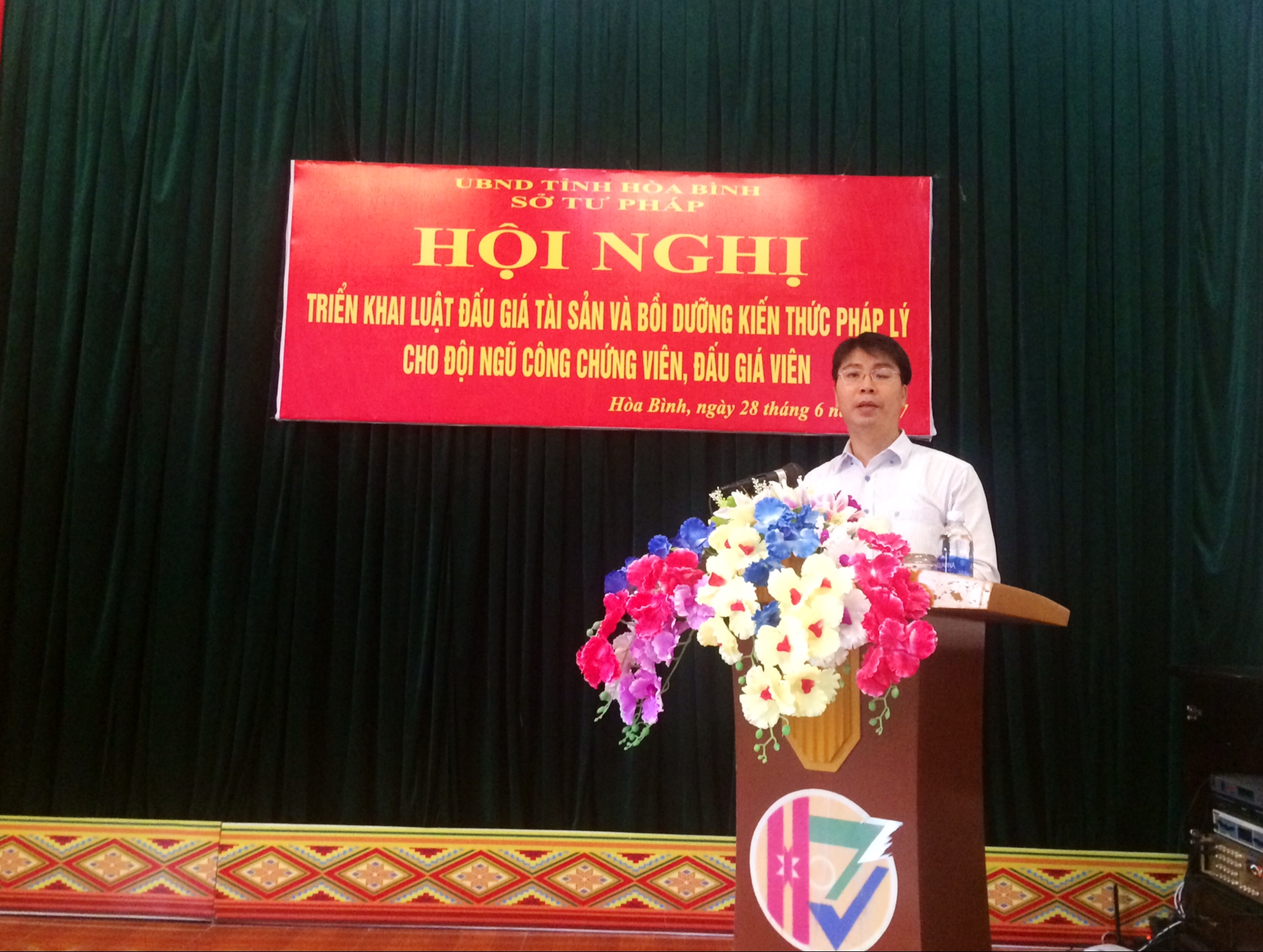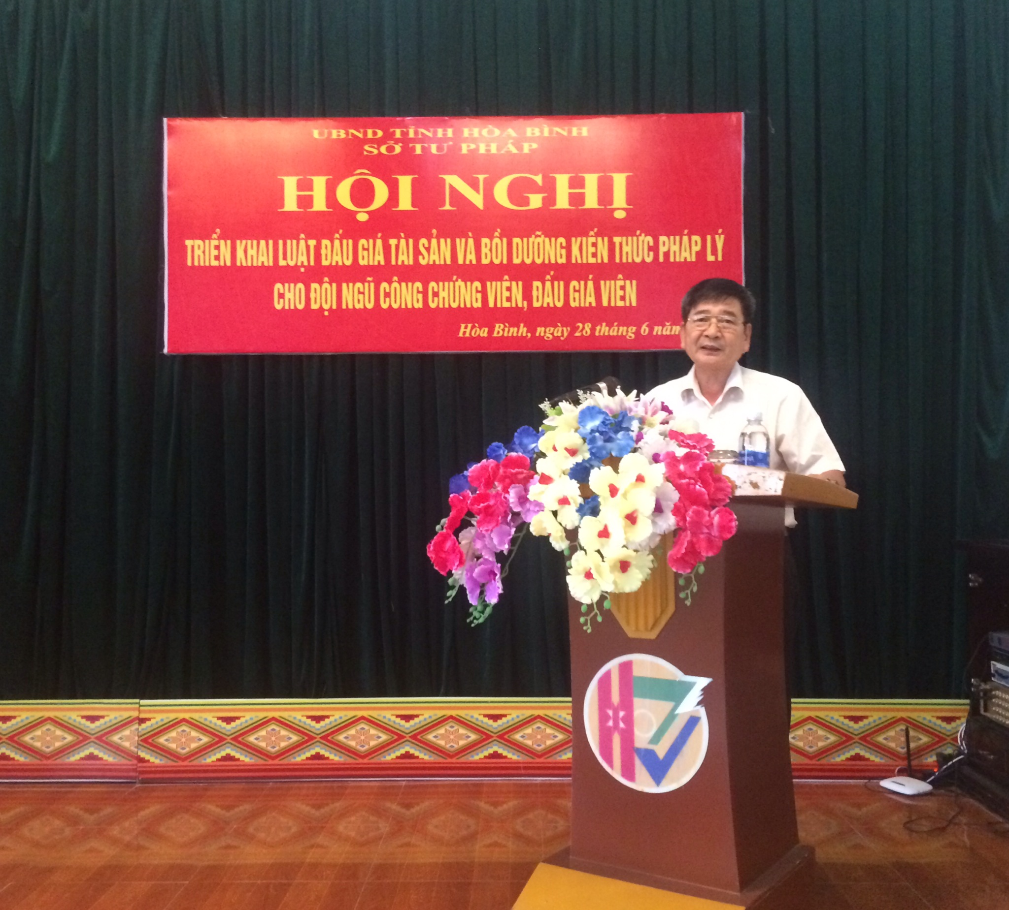Thực hiện kế hoạch số 52/KH-UBND ngày 04/5/2017 của UBND tỉnh về triển khai thi hành Luật Đấu giá tài sản trên địa bàn, ngày 28/6/2017 Sở Tư pháp tỉnh Hòa Bình đã tổ chức Hội nghị triển khai Luật đấu giá tài sản đến đại diện lãnh đạo một số ngành chức năng và của tỉnh và các tổ chức tín dụng, lãnh đạo UBND cấp huyện và các phòng: Tư pháp, Tài nguyên và Môi trường, Tài chính, Cục Thi hành án và bồi dưỡng kiến thức pháp lý cho đội ngũ công chứng viên, đấu giá viên, thư ký đấu giá và thư ký công chứng trên địa bàn.