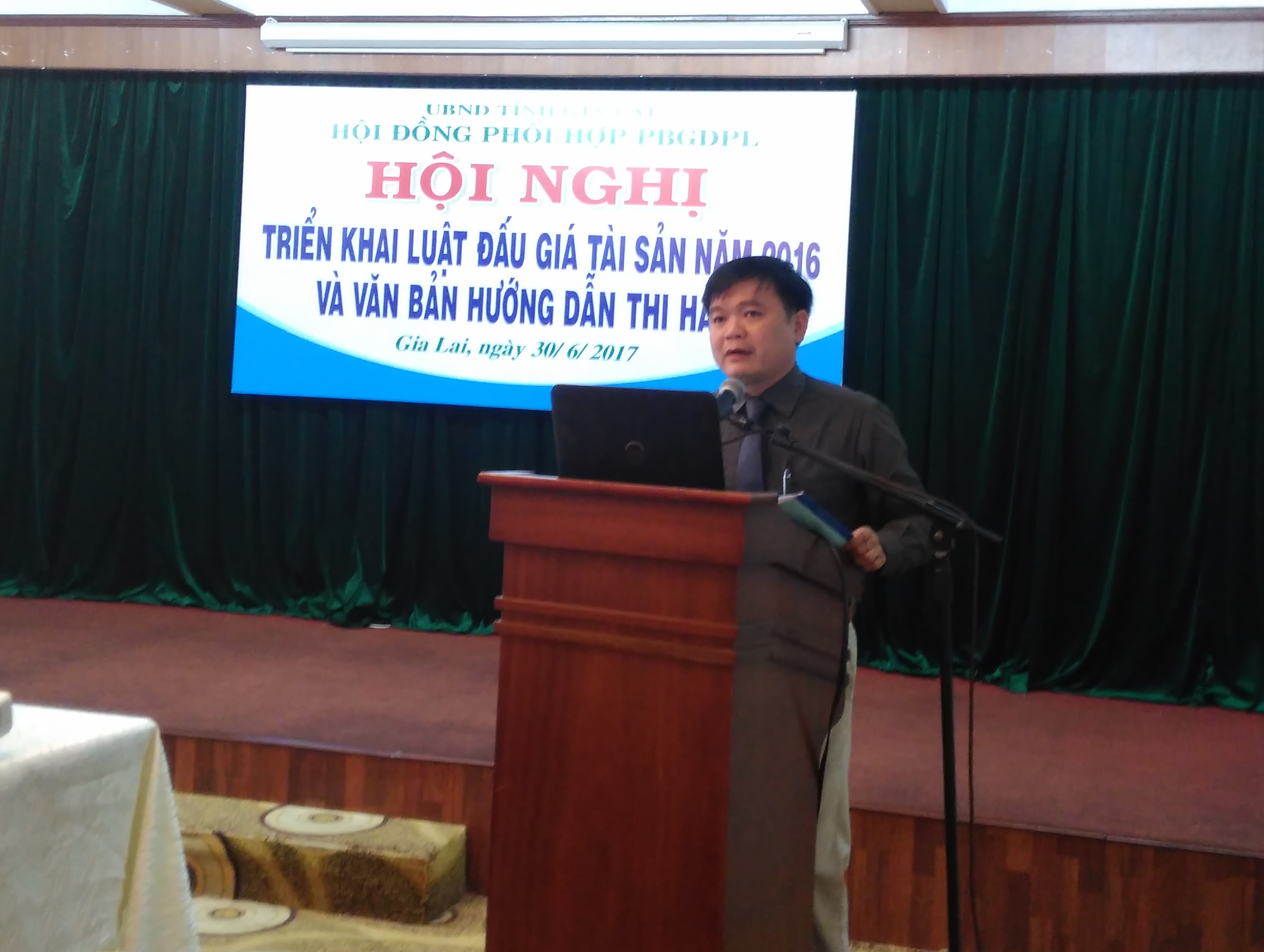 Thực hiện Kế hoạch hoạt động của Hội đồng phối hợp phổ biến, giáo dục pháp luật tỉnh Gia Lai năm 2017; Quyết định số 411/QĐ-UBND ngày 25/5/2017 của UBND tỉnh Gia Lai về việc ban hành Kế hoạch triển khai thi hành Luật đấu giá tài sản và Nghị định quy định chi tiết một số điều và biện pháp thi hành Luật. Ngày 30/6/2017, tại Hội trường Tre xanh Plaza - Thành phố Pleiku, Sở Tư pháp - Cơ quan thường trực của Hội đồng phối hợp PBGDPL tỉnh đã tổ chức Hội nghị triển khai Luật Đấu giá tài sản năm 2016 và văn bản hướng dẫn thi hành cho gần 80 đại biểu là Đấu giá viên; đại diện các tổ chức hành nghề công chứng; đại diện các sở, ban, ngành tỉnh; đại diện Lãnh đạo các phòng, đơn vị, trung tâm thuộc Sở Tư pháp, Phòng Tư pháp, Chi cục Thi hành án dân sự các huyện, thị xã, thành phố trên địa bàn tỉnh Gia Lai. Đ/c Đào Trọng Giáp - Phó Giám đốc Sở Tư pháp chủ trì Hội nghị.