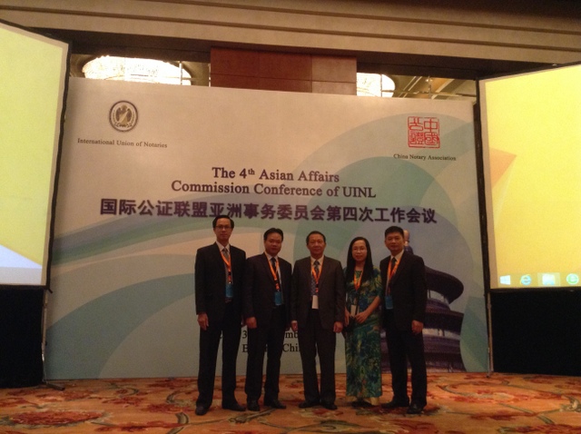 Hôm nay, ngày 03 tháng 9 năm 2014, Hội nghị thường niên lần thứ 4 Uỷ ban châu Á của Liên minh công chứng Quốc tế được tổ chức tại Bắc Kinh, Trung Quốc. Chủ đề của Hội nghị là sự phát triển của công chứng mỗi nước từ Hội nghị lần thứ ba đến nay, ứng dụng công nghệ trong công chứng và quyền, nghĩa vụ của công chứng viên. Hội nghị có sự tham gia của ông Daniel Cedar Senghor - Chủ tịch Liên minh, ông Jean Paul Decor - Chủ tịch danh dự của Liên minh, đại diện Hiệp hội công chứng 5 nước thành viên châu Á của Liên minh là Nhật Bản, Hàn Quốc, Mông Cổ, Trung Quốc, Việt Nam và một nước quan sát viên là Thái Lan. Về phía Chính phủ Trung Quốc, Thứ trưởng Bộ Tư pháp nước Cộng hoà nhân dân Trung Quốc đã tham dự Hội nghị và có bài phát biểu về tầm quan trọng của hoạt động công chứng đối với nền kinh tế - xã hội  Trung Quốc và hy vọng Hội nghị sẽ là cơ hội để thúc đẩy sự phát triển của hoạt động công chứng của quốc gia.