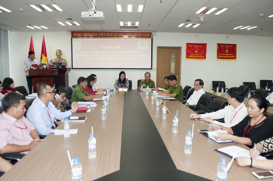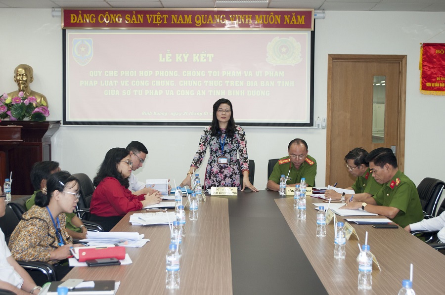 Sáng ngày 31/01/2018, tại Hội trường Sở Tư pháp tỉnh Bình Dương đã diễn ra lễ ký kết Quy chế phối hợp phòng, chống tội phạm và vi phạm pháp luật về công chứng, chứng thực trên địa bàn tỉnh Bình Dương giữa Sở Tư pháp và Công an tỉnh. Tham dự lễ ký kết có bà Nguyễn Anh Hoa - Giám đốc Sở Tư pháp, ông Trần Văn Chính - Phó Giám đốc Công an tỉnh, ông Võ Văn Lượng - Chánh Văn phòng Ủy ban nhân dân tỉnh, đại diện Ban Nội chính Tỉnh ủy, Ban Pháp chế Hội đồng nhân dân tỉnh, cùng một số Phòng chuyên môn thuộc Sở Tư pháp, Công an tỉnh và tất cả các tổ chức hành nghề công chứng trên địa bàn tỉnh.