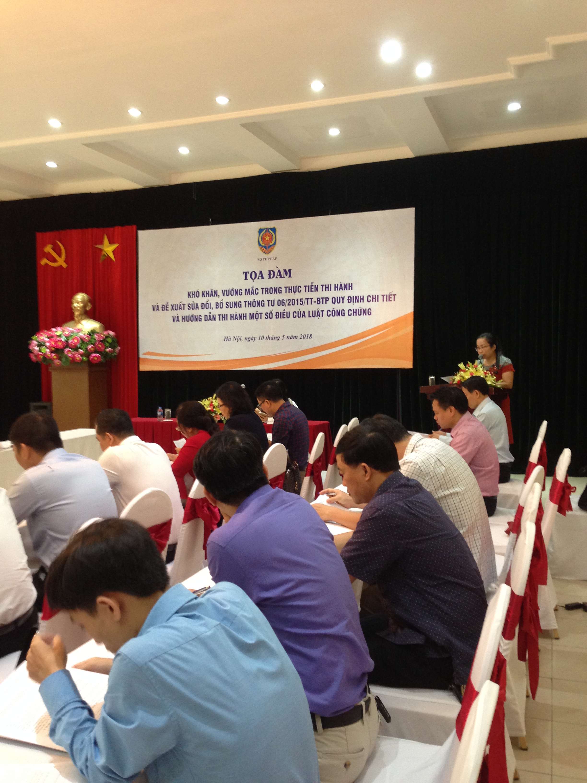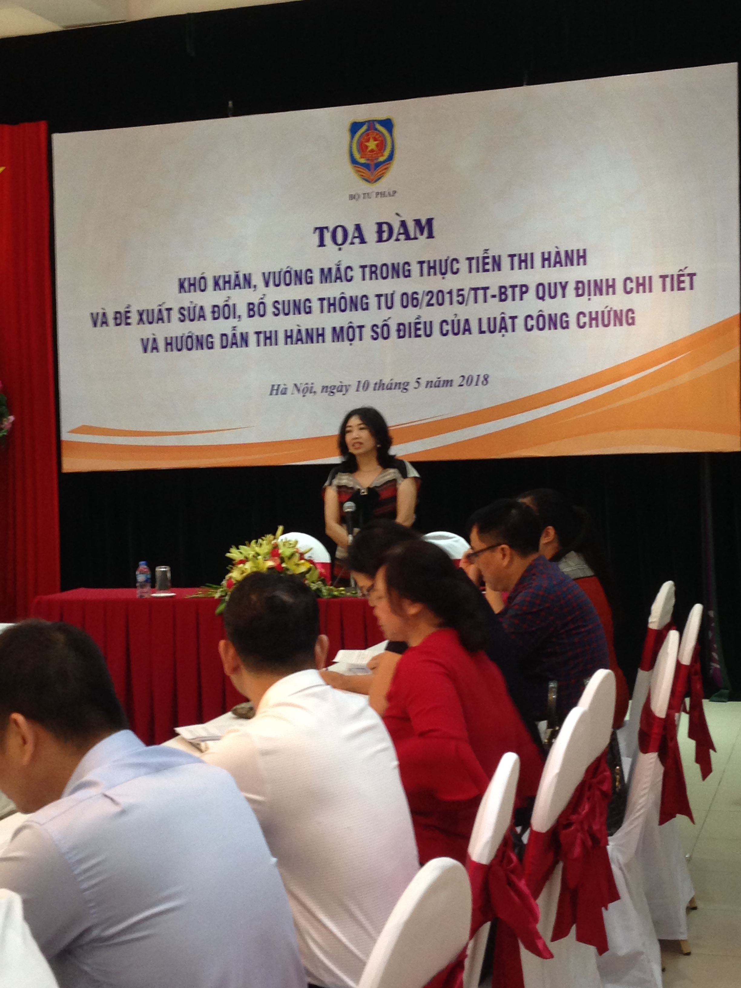 Thực hiện Quyết định số 797/QĐ-BTP ngày 20/4/2018 của Bộ trưởng về Kế hoạch tổ chức Hội nghị, hội thảo, tọa đmà, tập huấn và các đoàn thanh tra, kiểm tra, khảo sát của Bộ Tư pháp, ngày 10/5/2018 Cục Bổ trợ tư pháp đã tổ chức Tọa đàm về khó khăn, vướng mắc trong tổ chức thực hiện Luật công chứng và các văn bản hướng dẫn thi hành phục vụ việc sửa đổi, bổ sung Thông tư số 06/2015/TT-BTP ngày 15/6/2015 quy định chi tiết và hướng dẫn thi hành một số điều của Luật công chứng kết hợp với Tọa đàm về khó khăn, vướng mắc trong việc thực hiện Quyết định số 2104/QĐ-TTg ngày 29/12/2012 phê duyệt “Quy hoạch tổng thể phát triển tổ chức hành nghề công chứng đến năm 2020”.