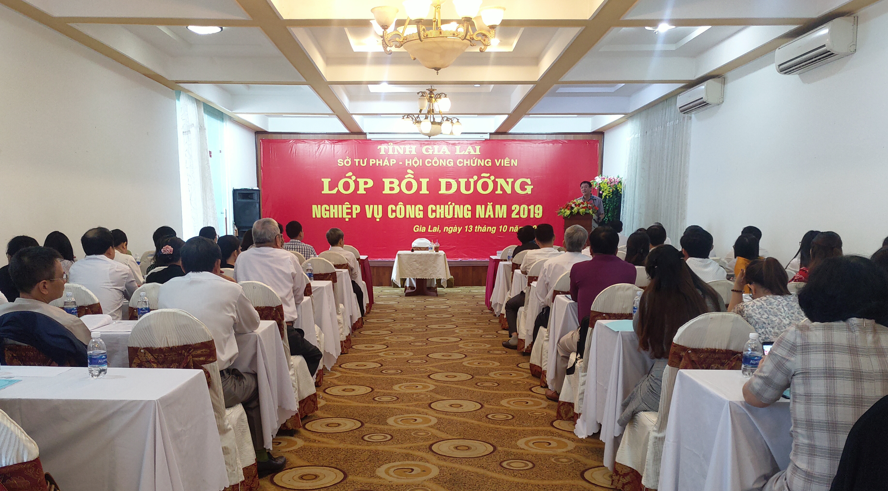 Ngày 13/10/2019, tại Hội trường Khách Sạn Tre xanh Plaza, thành phố Pleiku - Hội Công chứng viên tỉnh Gia Lai phối hợp với Sở Tư pháp tổ chức Lớp bồi dưỡng nghiệp vụ công chứng năm 2019. Tham dự Lễ khai mạc có ông Dương Văn Thành - Phó Giám đốc Sở Tư pháp, ông Phạm Huy Vũ - Chủ tịch Hội Công chứng viên tỉnh Gia Lai và hơn 60 học viên là Công chứng viên, Chuyên viên, Nhân viên đến từ Các Phòng/Văn phòng Công chứng trên địa bàn các tỉnh Gia Lai, Bình Định, Kon Tum, Đăk Lăk.