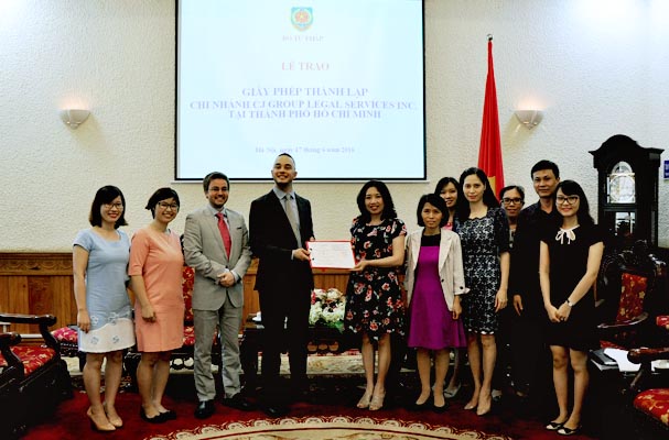 Chiều ngày 17/6, Cục trưởng Cục Bổ trợ tư pháp Đỗ Hoàng Yến đã trao giấy phép thành lập cho Chi nhánh CJ Group Legal Services Inc. tại thành phố Hồ Chí Minh cho Luật sư Lawrence Brisebois, Trưởng Chi nhánh.