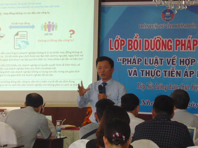 Tiến sỹ Luật sư Nguyễn Đình Thơ – Chủ nhiệm Đoàn Luật sư tỉnh cho biết: từ năm 2012 đến nay, được sự hỗ trợ của Chương trình 585 (Chương trình hỗ trợ pháp lý cho doanh nghiệp - Bộ Tư pháp), hàng năm Đoàn Luật sư phối hợp với Hội Doanh nghiệp trẻ tỉnh tổ chức lớp bồi dưỡng kiến thức pháp luật cho doanh nghiệp trên địa bàn tỉnh nhằm cung cấp những kiến thức pháp luật mới về kinh doanh cũng như thực tiễn giải quyết các tranh chấp về hợp đồng kinh doanh tại Khánh Hòa nói riêng và cả nước nói chung. Bên cạnh đó, việc tổ chức lớp bồi dưỡng là nhằm tạo cơ hội để doanh nghiệp có điều kiện giao lưu, trao đổi về những vướng mắc thường gặp trong hoạt động sản xuất kinh doanh; qua đó giúp cho các Luật sư nắm được những khó khăn về pháp lý của doanh nghiệp để có hướng hỗ trợ, giúp đỡ doanh nghiệp kịp thời tháo gỡ vướng mắc, thúc đẩy hoạt động sản xuất kinh doanh. Đặc biệt, qua việc tham gia những lớp học này sẽ giúp giới chủ doanh nghiệp nâng cao nhận thức pháp lý, ý thức chấp hành pháp luật và thói quen tuân thủ pháp luật trong hoạt động kinh doanh, phòng chống rủi ro pháp lý và tăng cường năng lực cạnh tranh của doanh nghiệp.